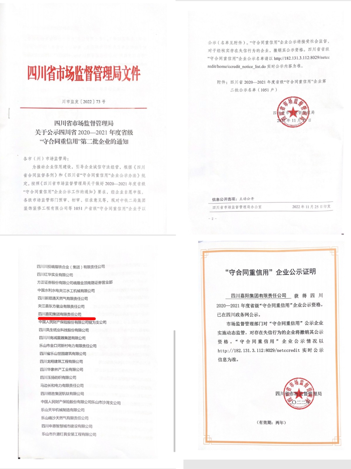 近日,四川2020—2021年度省級“守合同重信用”企業(yè)評選結(jié)果揭曉,嘉陽集團榜上有名,再度蟬聯(lián)這一稱號。
