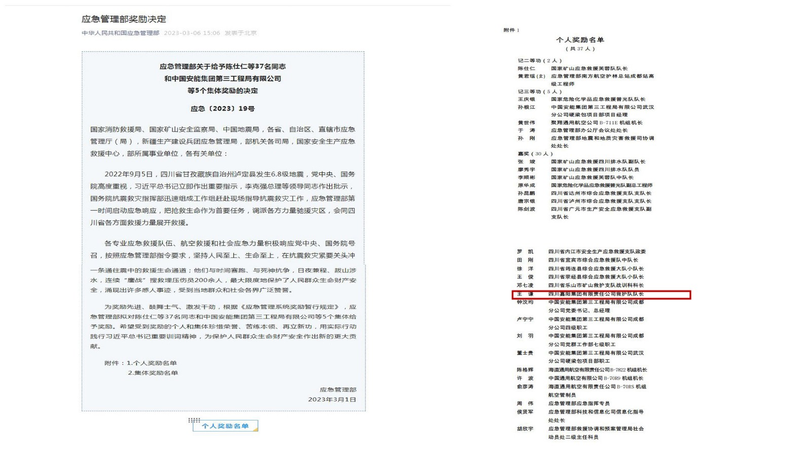 近日,應(yīng)急管理部[2023]19號文件下發(fā),對瀘定抗震救災(zāi)表現(xiàn)突出的個(gè)人和集體進(jìn)行獎(jiǎng)勵(lì),嘉陽集團(tuán)礦山救護(hù)隊(duì)隊(duì)長王謙榜上有名。