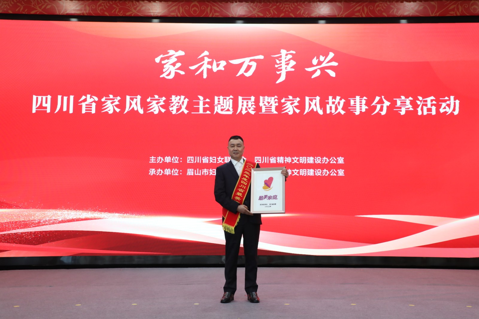 活動現(xiàn)場,省文明辦副主任胡偉、眉山市人大常委會副主任王澤文為最美家庭代表頒獎。活動還開展了家風(fēng)故事分享、“四川省家和萬事興——家風(fēng)家教主題展”啟動儀式等。