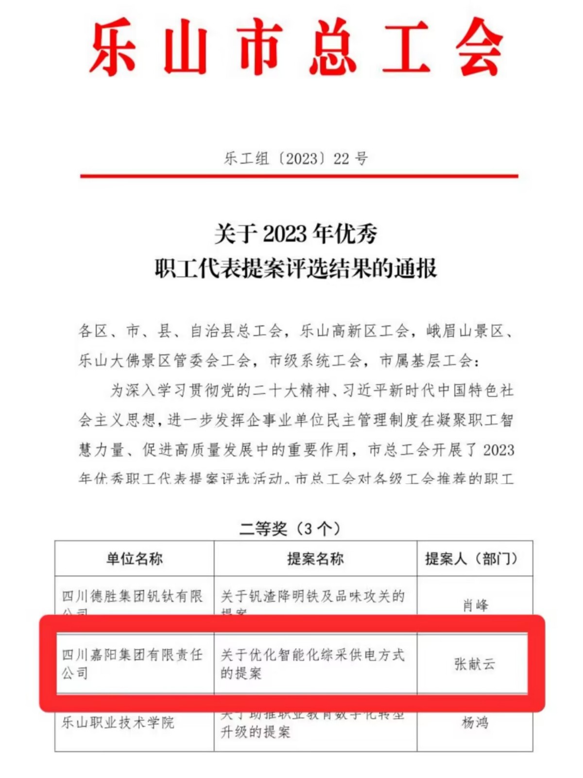日前,嘉陽煤礦采煤二隊(duì)技術(shù)員張獻(xiàn)云在樂山市總工會(huì)開展的2023年優(yōu)秀職工代表提案評(píng)選活動(dòng)中斬獲二等獎(jiǎng),集團(tuán)工會(huì)獲得優(yōu)秀組織獎(jiǎng)。