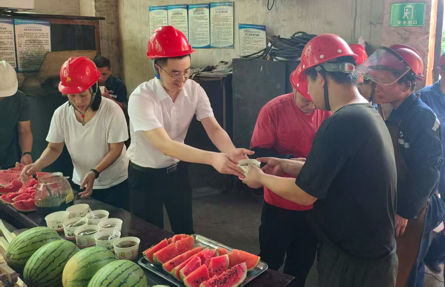 機(jī)關(guān)第四黨支部分別前往宜賓福溪粉煤灰公司和機(jī)電制造維修分公司開展“送清涼、送安全、送祝福”活動(dòng)。在福溪粉煤灰公司,黨委副書記、工會(huì)主席謝建國(guó)為高溫戰(zhàn)線的職工送上礦泉水和西瓜,叮囑大家注意個(gè)人防護(hù),預(yù)防中暑。謝建國(guó)了解了粉煤灰公司安全生產(chǎn)等多方面的情況,提醒經(jīng)營(yíng)班子關(guān)注夏季高溫對(duì)職工的影響,加強(qiáng)與職工的溝通交流,及時(shí)為職工解難事、辦實(shí)事,確保職工隊(duì)伍穩(wěn)定,助力平安度夏。
