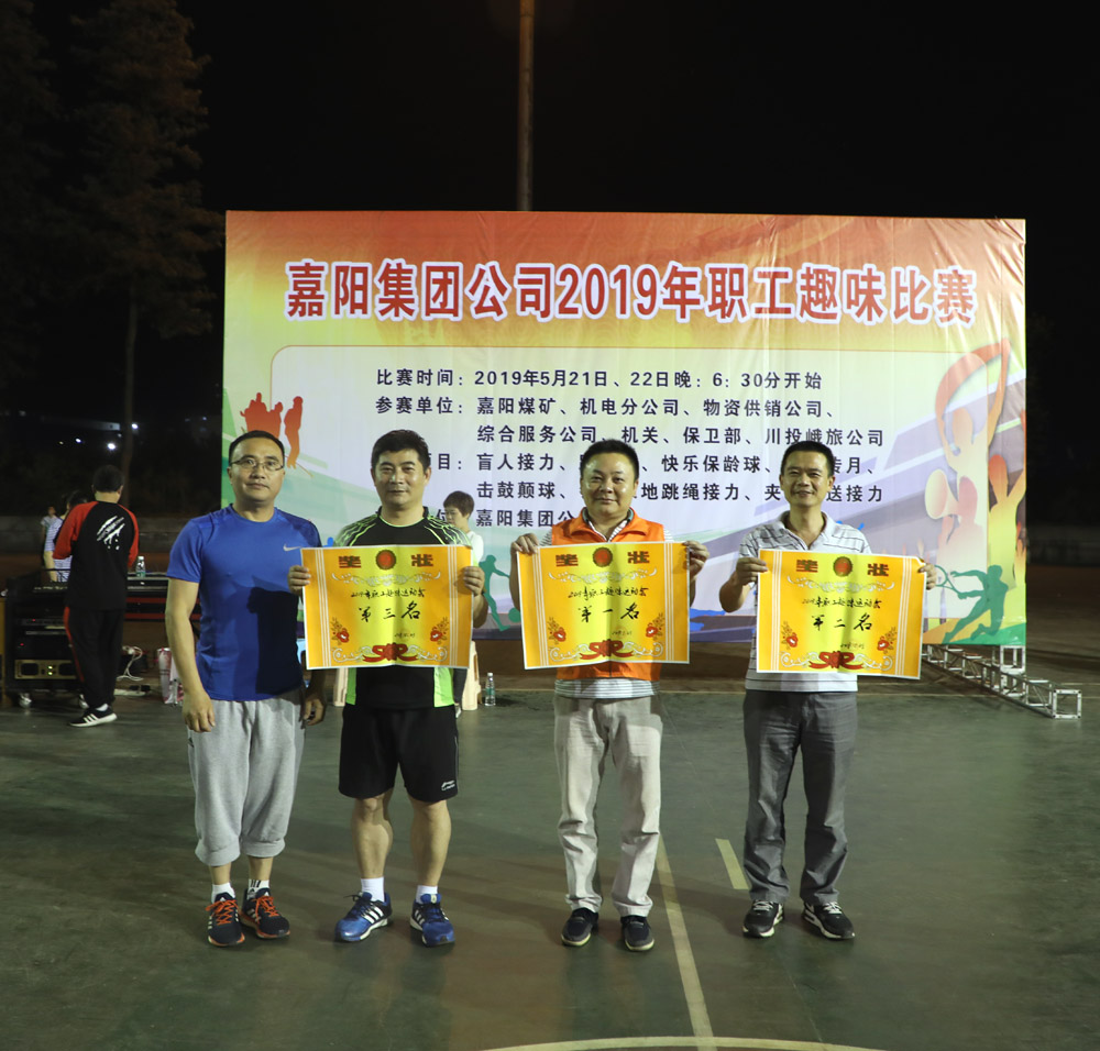 海底傳月、鉆圈、跳大繩均是14人的集體項(xiàng)目,對各隊(duì)團(tuán)隊(duì)協(xié)作能力是一次考驗(yàn)。第一天比賽中盲人接力笑料百出,要求比賽隊(duì)員戴上趣味眼罩,旁邊一人在不觸碰比賽隊(duì)員的情況下指揮他在規(guī)定的賽道完成接力挑戰(zhàn),找不到方向走出賽道的大有人在??鞓繁}g球要求在規(guī)定的距離用氣排球滾擊礦泉水瓶,將其擊倒多者獲勝,期間有人一擊數(shù)瓶也有人擦瓶而過。8個(gè)項(xiàng)目既是比賽也是游戲,讓人樂在其中,回味無窮。參賽的七支隊(duì)伍各顯神通各有千秋。保衛(wèi)部在兩天的比賽中一舉拿下3項(xiàng)第一,鎖定冠軍,機(jī)關(guān)獲得第二,嘉陽煤礦喜奪季軍,集團(tuán)公司黨委書記、董事長杜勤為獲獎(jiǎng)單位頒獎(jiǎng)。