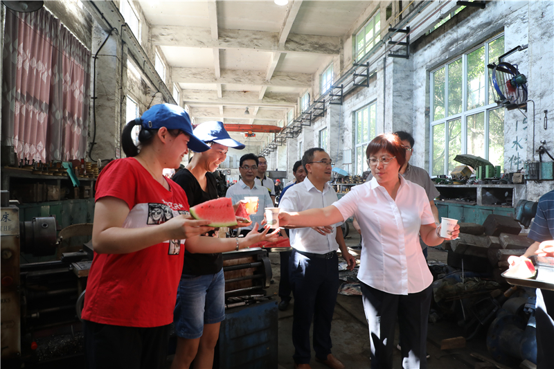 劉曉揚主席一行人不顧長途行車的勞頓,下車直奔驕陽下的嘉陽煤礦井口工業(yè)廣場,下車間、走作業(yè)現(xiàn)場,劉曉揚主席一邊招呼大家停下手中的工作休息,一邊將西瓜、冰粉、礦泉水等解暑飲品送到職工手中,并關(guān)切地詢問職工生產(chǎn)、生活等情況,囑咐大家在高溫作業(yè)時,要注意防暑降溫,增強自身安全防范意識,合理安排作業(yè)內(nèi)容,確保自身身體健康和企業(yè)安全生產(chǎn)。