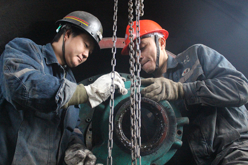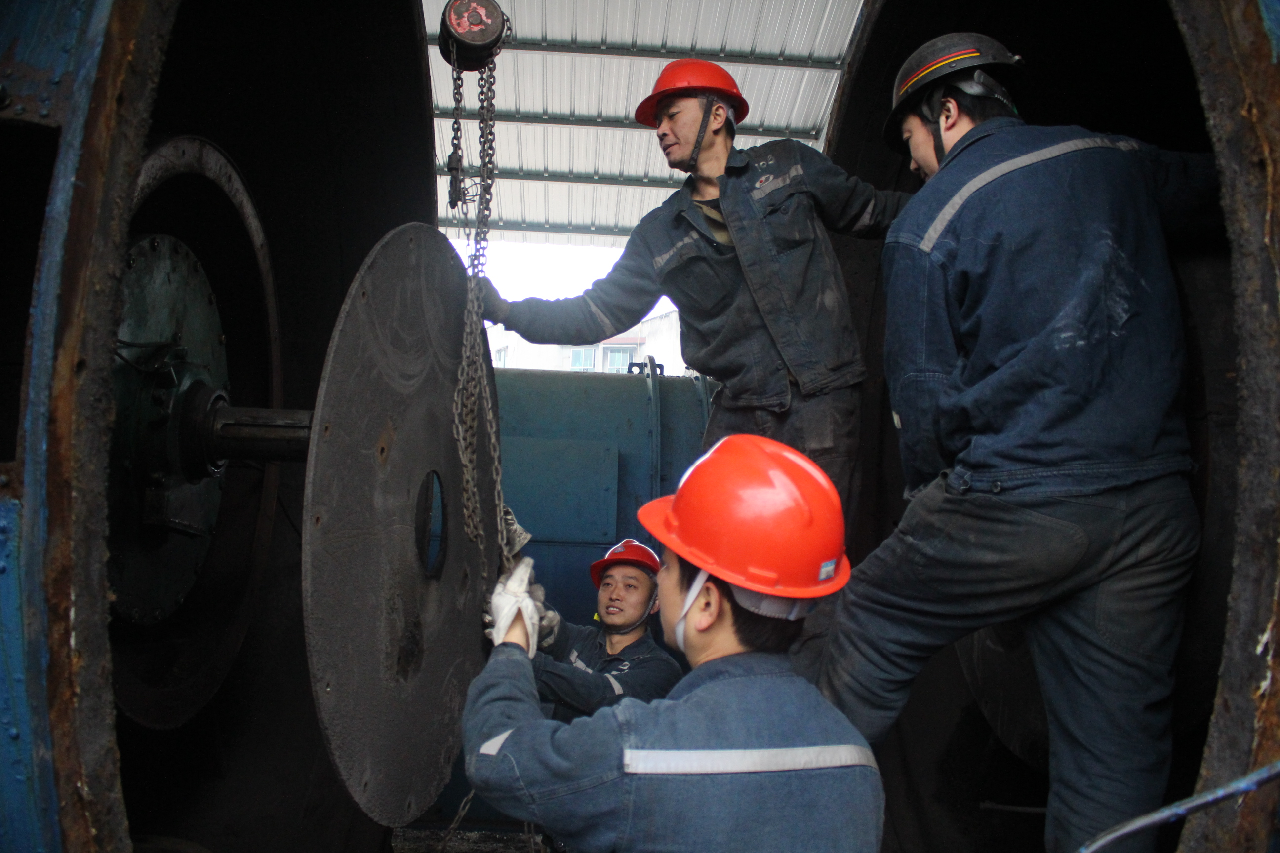碩大體積的主要通風(fēng)機(jī)打開“體腔”工序多、操作環(huán)節(jié)多,而現(xiàn)場工位受限并非人越多越好,況且故障時(shí)間是中班,結(jié)合班組實(shí)情,機(jī)電隊(duì)電鉗工在隊(duì)管的組織下拉開了接力檢修的序幕,從故障發(fā)生起,多名電鉗工與時(shí)間賽跑,搶進(jìn)度、找根源、除病灶,現(xiàn)場用手動葫蘆拉主機(jī)、打開主機(jī)腔體、拆除風(fēng)輪、清除受損葉片、檢查軸承、維護(hù)防爆圈、打磨變形軸、清理備用配件、新風(fēng)葉對應(yīng)編碼……,一級供電負(fù)荷的“康復(fù)”之旅盡在這些忙碌的身影中,沒有專業(yè)的無影燈,只有普通的礦燈,束束光亮點(diǎn)綴著一幅新的勞動畫卷;沒有干凈衛(wèi)生的手術(shù)臺,只有冷冰冰的材料和工具,并不整潔的搶修現(xiàn)場,那專注的神情和一絲不茍的技術(shù)鉆研精神卻在這里展現(xiàn)的淋漓盡致!