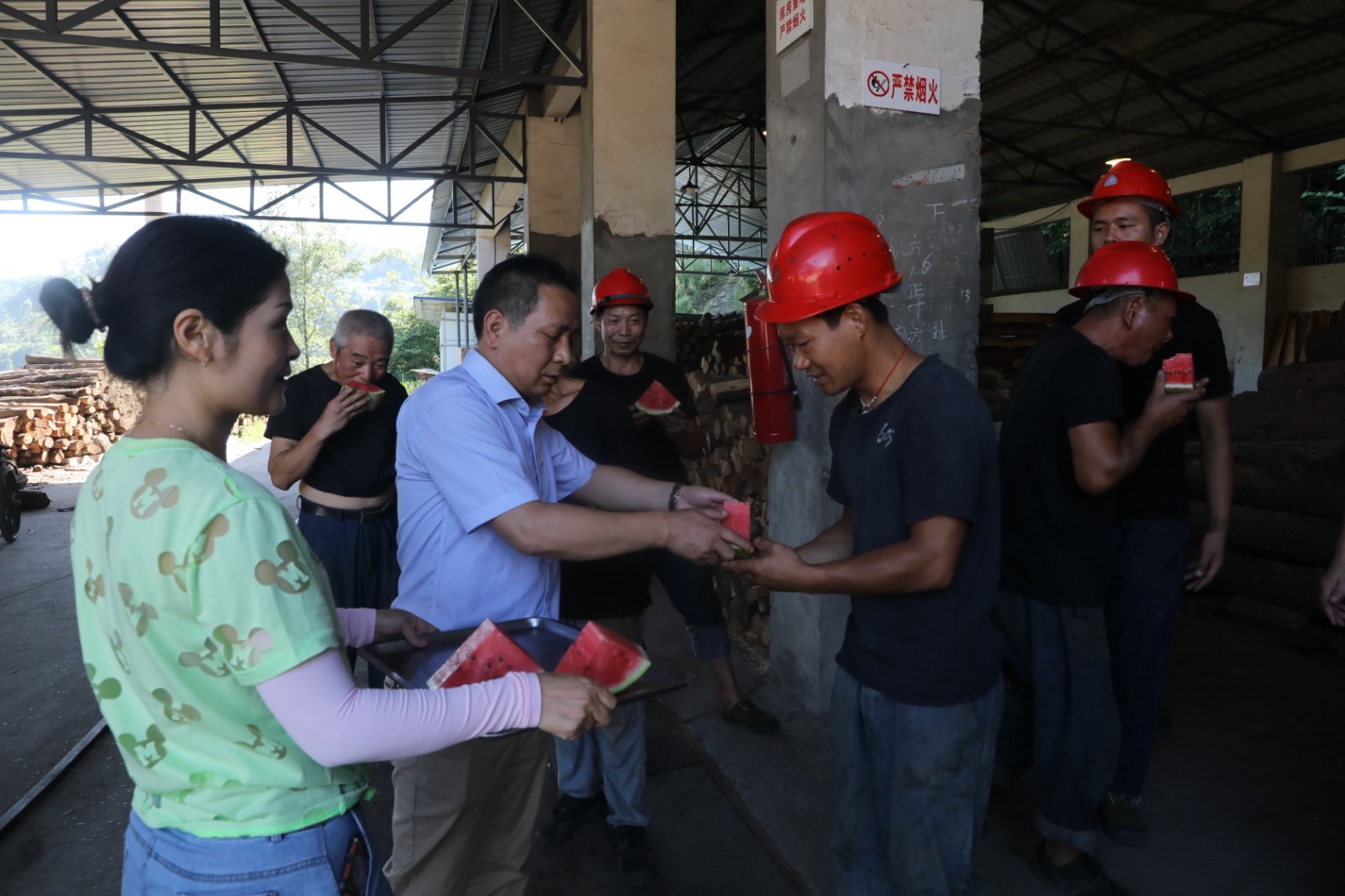 在物資供銷公司倉儲部、木材庫、炸藥庫,副總經(jīng)理王維洪、總經(jīng)理助理豐雄龍等二支部分會人員向作業(yè)人員送去了西瓜、礦泉水等清涼消暑物品,叮囑他們在工作的同時做好防暑降溫。分會還檢查了物資供銷公司防暑降溫工作措施,防暑藥品發(fā)放情況。副總經(jīng)理王維洪對他們說:“班組在布置工作時要靈活安排,盡可能避開高溫時段在室外作業(yè);無法避免時,要準備好防暑藥品,落實好防暑措施,防止高溫中暑。”