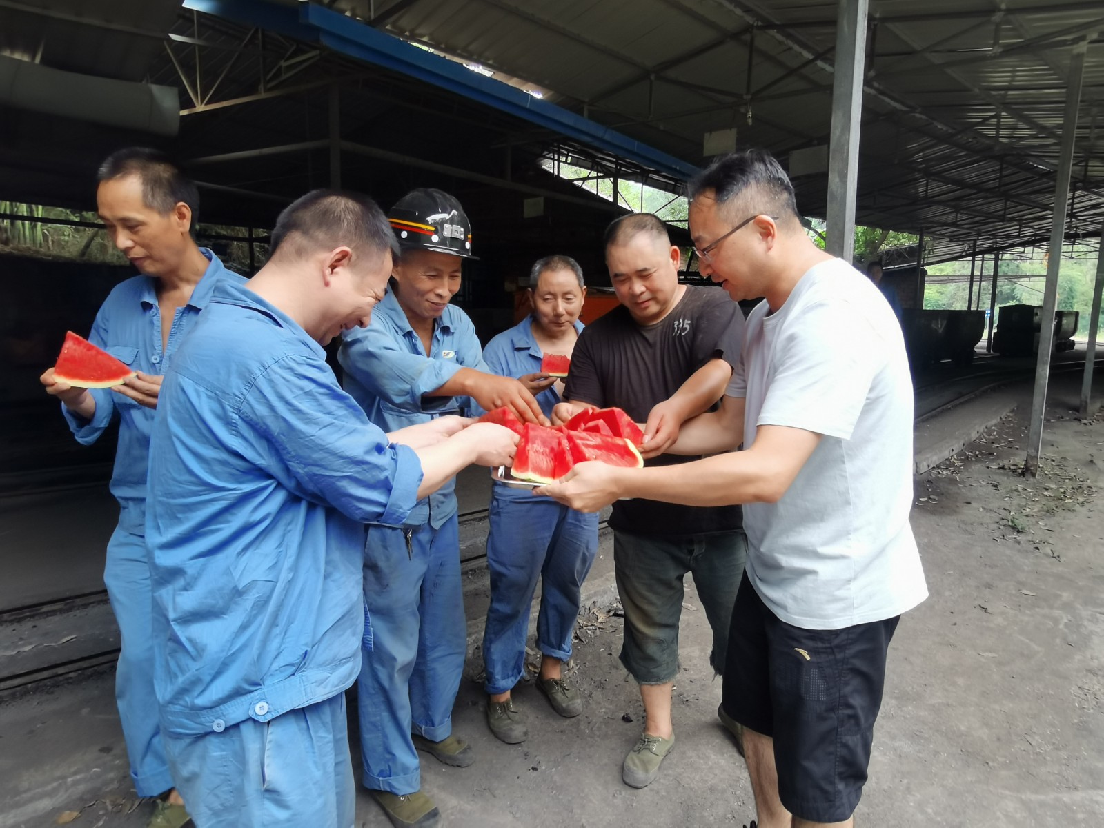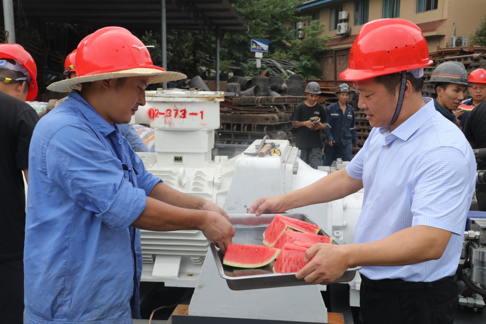持續(xù)高溫天氣,酷熱難當,天錫井工業(yè)廣場卻是一派熱火朝天的繁忙景象。為了智能化綜采全系統(tǒng)聯(lián)合試運轉(zhuǎn)工作如期圓滿完成,盡管天氣炎熱,工人師傅們個個揮汗如雨,但仍然全力奮戰(zhàn)在工地上……7月30日,集團公司總經(jīng)理范勤英帶領(lǐng)機關(guān)三支部的黨員看望慰問作業(yè)人員,送上清涼的西瓜、礦泉水,表達組織的關(guān)心和問候,并一再盯囑相關(guān)負責同志:天氣炎熱、安裝工作緊張,更要切實做好職工的防暑降溫工作,合理安排好露天作業(yè)時間,確保地面一線作業(yè)人員的身體健康和安全。