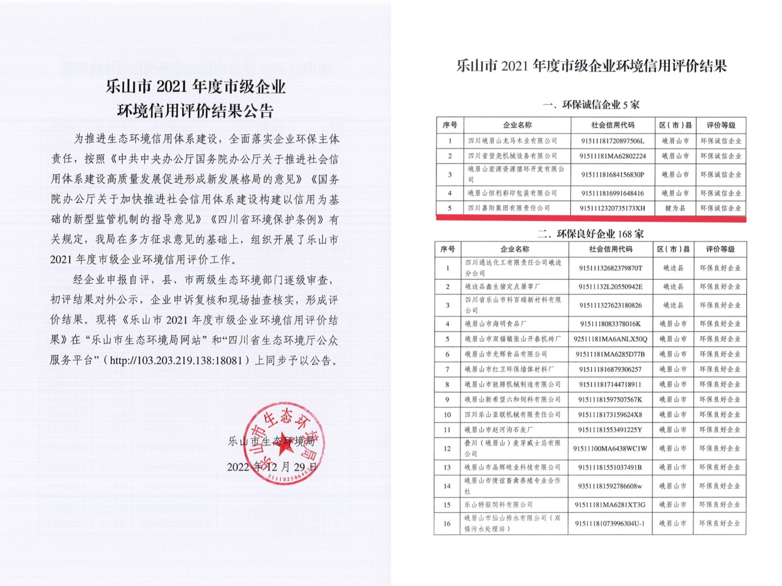 12月29日,樂(lè)山市生態(tài)環(huán)境局公布了2021年度市級(jí)企業(yè)環(huán)境信用評(píng)價(jià)結(jié)果公告,嘉陽(yáng)集團(tuán)榮獲此次環(huán)境信用評(píng)價(jià)中的最高等級(jí)“環(huán)保誠(chéng)信企業(yè)”稱號(hào),這也是嘉陽(yáng)集團(tuán)連續(xù)四年獲得該項(xiàng)榮譽(yù)。
