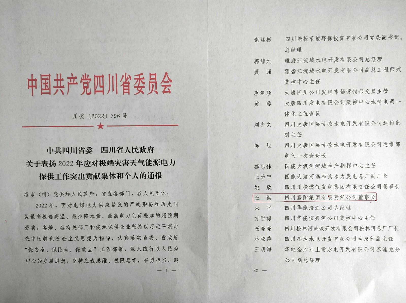 近日,中共四川省委 四川省人民政府對2022年應對極端災害天氣能源電力保供工作突出貢獻集體和個人進行通報表揚,嘉陽集團黨委書記、董事長杜勤榜上有名,再獲殊榮。