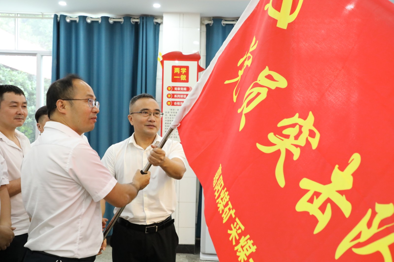 黨委書記杜勤將印有“黨員突擊隊”大字的嶄新旗幟鄭重授予采煤一隊黨支部書記黃建,希望黨支部高舉旗幟,團結(jié)全體黨員攜手前行,以更加飽滿的熱情在企業(yè)高質(zhì)量發(fā)展征程上再創(chuàng)佳績。