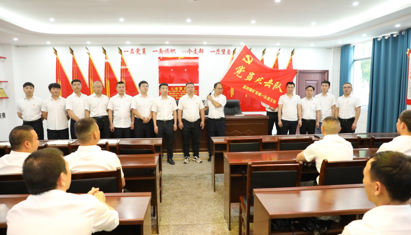 “你們是不畏艱險的生力軍……”6月15日,嘉陽煤礦采煤一隊黨支部在黨群活動室舉行“黨員突擊隊”授旗儀式,深入推進主題教育走深走實,公司黨委書記、董事長杜勤授予黨支部“黨員突擊隊”旗幟,為黨員干部添信心、鼓干勁,號召全體黨員強化示范引領(lǐng),團結(jié)職工再建新功。
