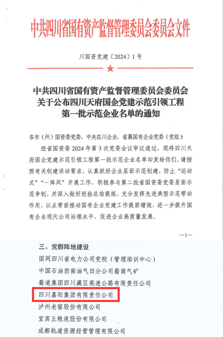 近日,省國資委黨委以川國資黨建〔2024〕1號文件公布四川天府國企黨建示范引領(lǐng)工程第一批示范企業(yè)名單,四川嘉陽集團(tuán)有限責(zé)任公司榜上有名。
