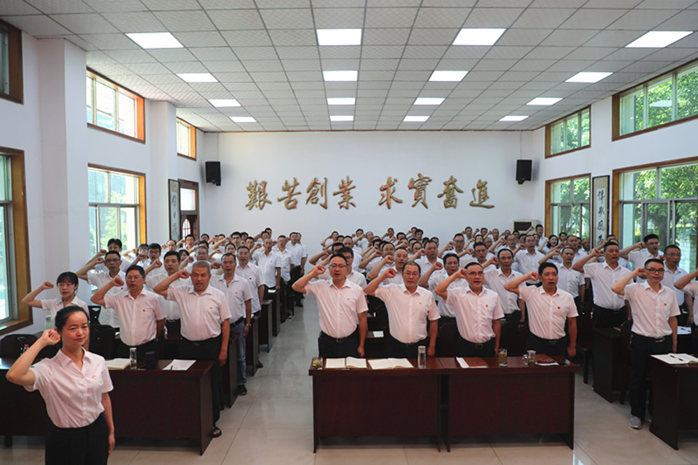 面對(duì)鮮紅的黨旗,100名共產(chǎn)黨員舉起右手,發(fā)出錚錚誓言,響亮的聲音在辦公樓久久回蕩。